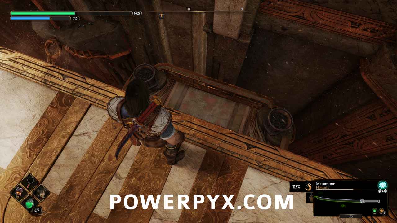 This treasure chest is on a balcony on the northeast side of the central path, directly across from the Polearm Seneschal.