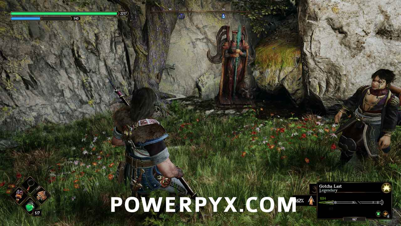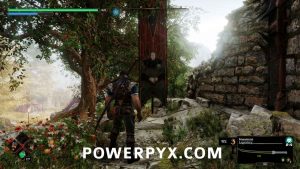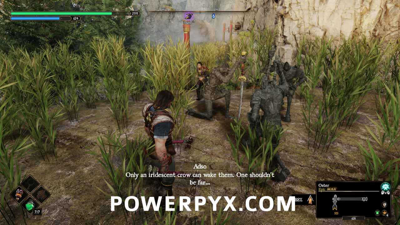 Head back to the path between the two raised crop fields at the beginning of the area, and follow that path until you reach the end of a wooden fence to the east. If you follow the stone wall on the east side of the path, it will curve away to the east and end at a staircase. Head up the staircase, go north till you hit a huge rock, then look to the east. There will be a field to the east, and a boulder to the southeast. Go east around that boulder, then head south to find three Templars of the Sacred Steel, holding two Stamina Gems and a Nerea’s Tear. If you hit their petrified form, the location of the Iridescent Crow that will free them will appear on your compass and mini-map. Head to that location and approach the crow, and he will fly off in the direction of the Templar. You will have to approach the crow multiple times to get them to finally perch on the Templar and trigger the fight.