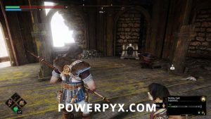 At the bottom of the stairs you’ll see the seneschal on the other side of the room.