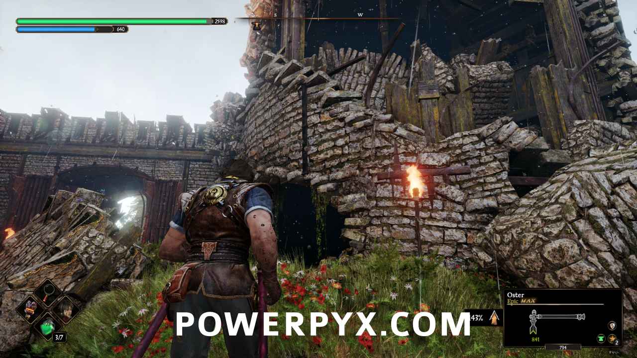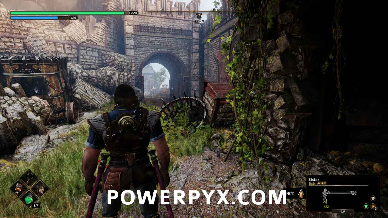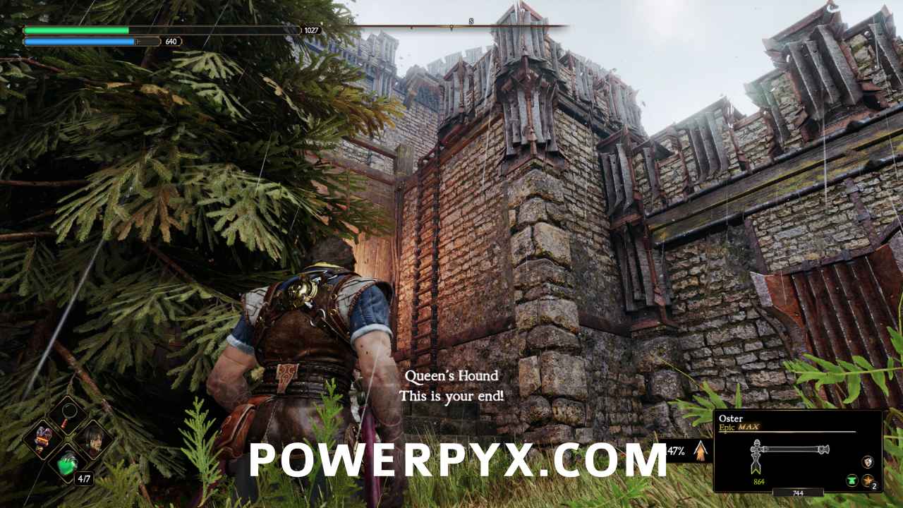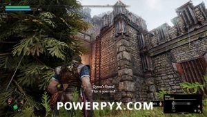 Follow the path until you reach the outer gate, and you’ll see a ladder to the southeast. Climb up and walk across the top of the gate, and you’ll see the seneschal on the other side.