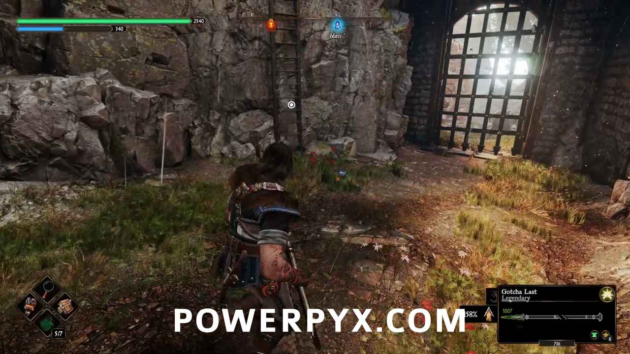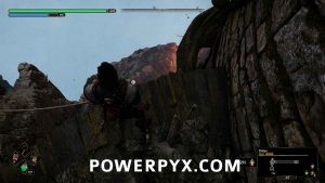 Head outside and head back to the northwest, but don’t go through the archway. Look to the west and you’ll see a ladder on the side of the arch. Climb up to the top and head straight ahead to enter the tower.