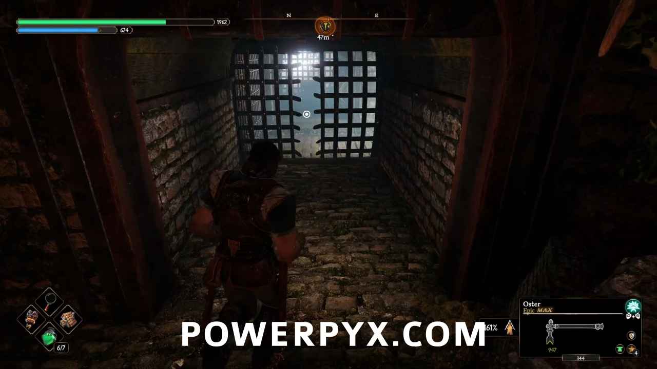 Head through the gate to the northwest, and follow the hall to a grate that has a gap in the middle you can squeeze through.