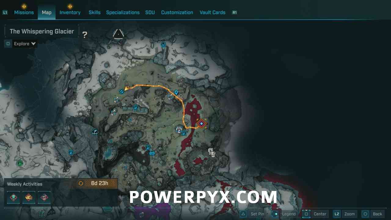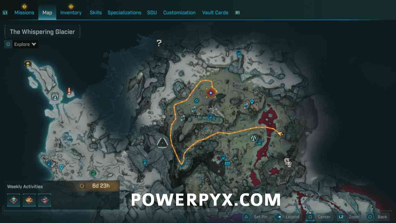 - Starting Location: Kairos > The Whispering Glacier > Bloodstained Hollow