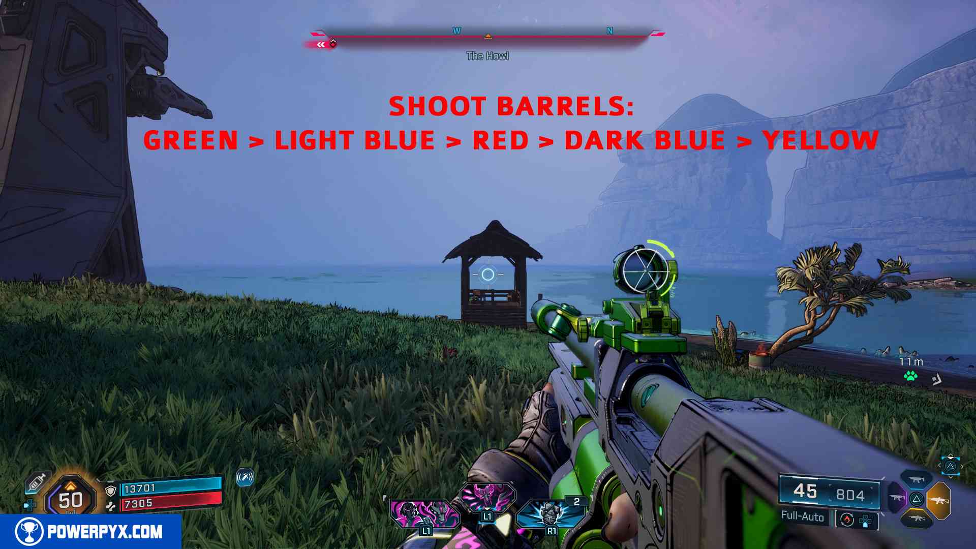 This can be found in The Fadefields > The Howl, in the south-west corner of the region at the boarder to Coastal Bonescape. There at the edge of the map by the water, you can find a little gazebo with colored barrels around it. You must shoot the barrels in this order: green > light blue > red > dark blue > yellow. Then the cutout of Dr. Patricia Tannis will pop out of the ocean. |