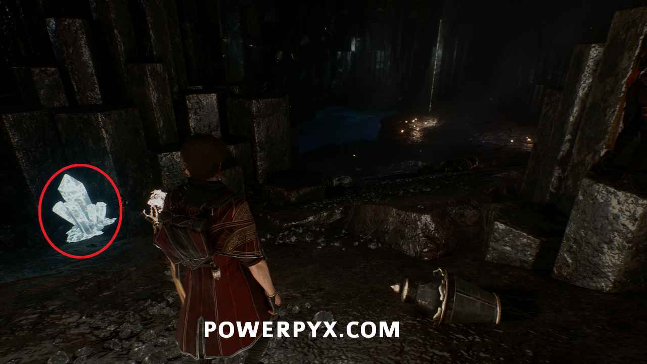 Key Item: Rock Crystal #2 – Go up the slope in the middle of the room, the second crystal is behind the middle pillar.