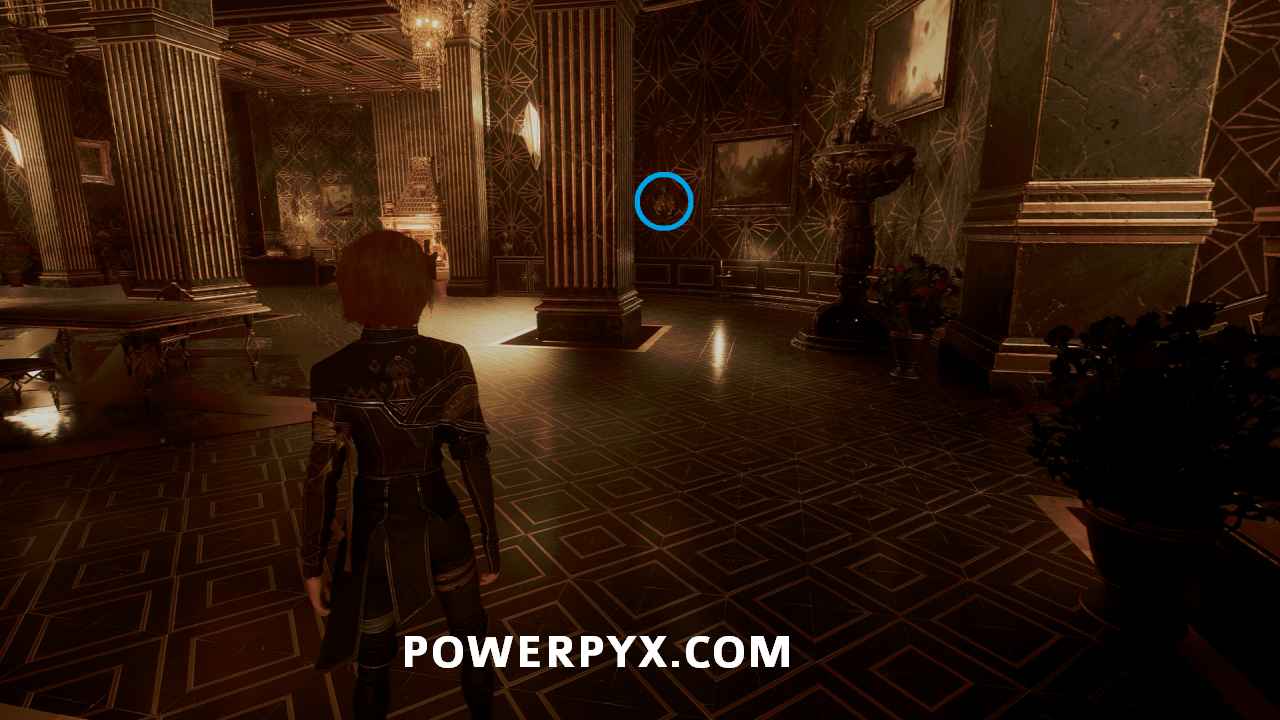 You can then go through the door on the opposite side of the kitchen to enter the main part of The Manor where you were earlier in the story. Go into the main hall with the long table and there are four wall decorations you can interact with. On the immediate right when you enter.