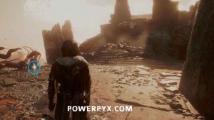 From the flag take the path on the right closest to the floating mask up to a ruined camp where the journal is located.