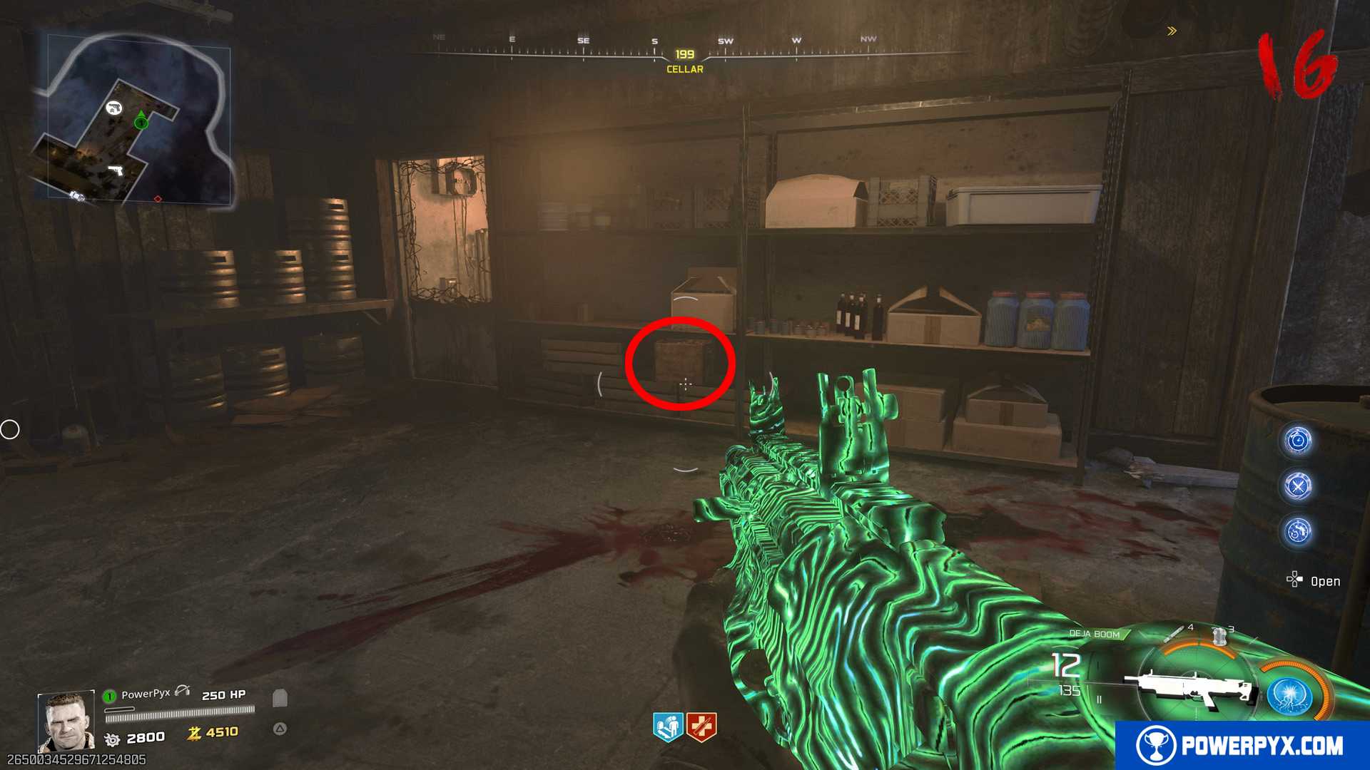 2 – Ashwood > Hargrove’s Mercantile: Go up the zipline across from the garage, then buy the right door to reach Hargrove’s Mercantile (where an armor wallbuy is). In the room with the armor wallbuy, next to the door pick up the item from the small crate on the floor in the shelf. When looking at the armor wallbuy look at the door to the left, and from this door it’s the shelf to the immediate left.