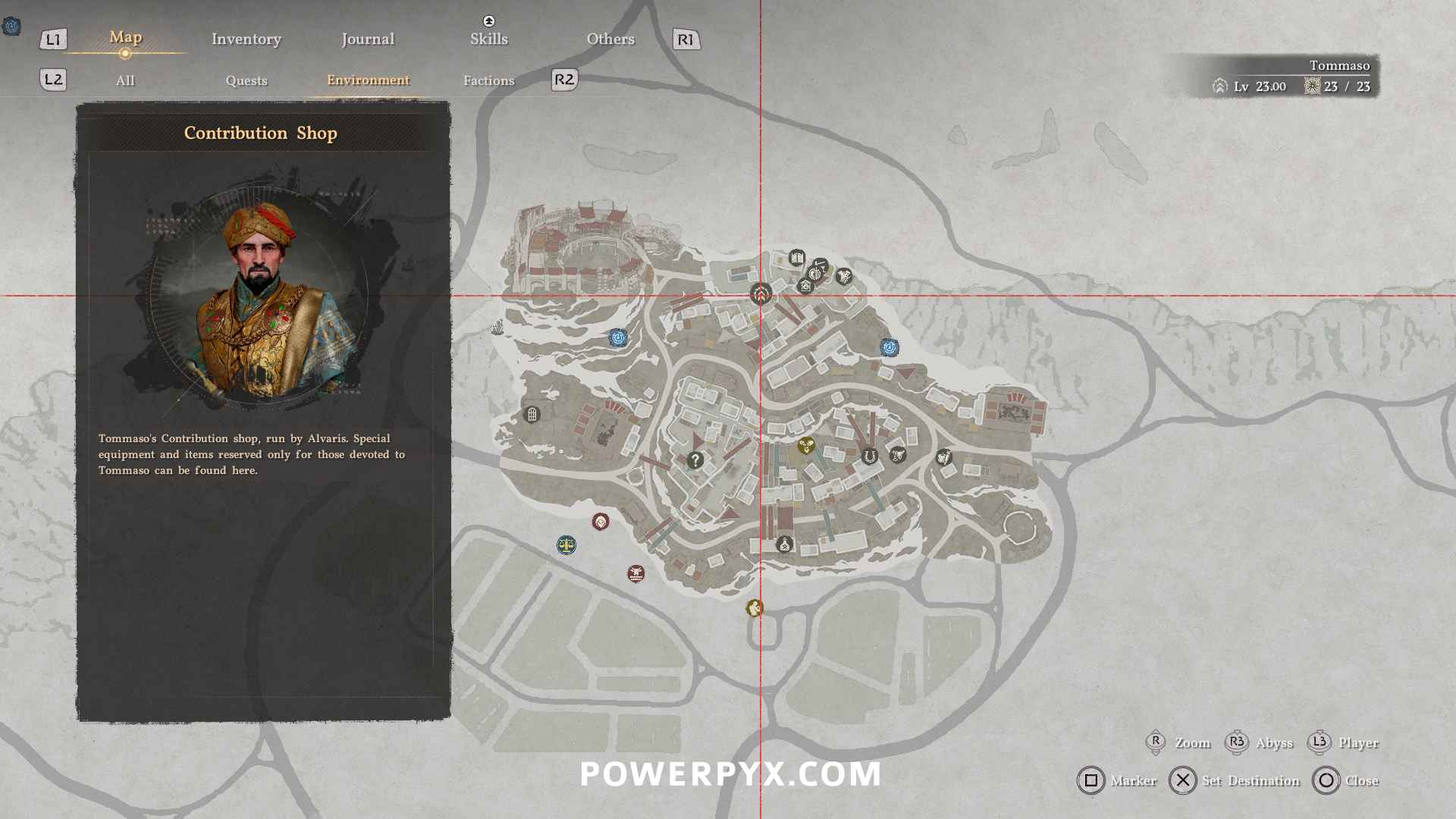 On the world map’s “Environment” tab the contribution shops are indicated by question marks (“?”) after unfogging the map. Two of them are behind locked doors which can be opened with any Key dropped by enemies or bought from Back Alley Shops.