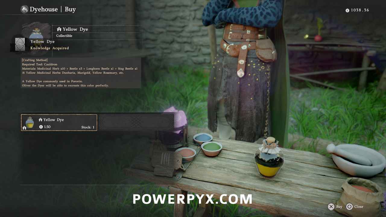 Dyehouse #2: Yellow Dye – inside Pororin Village, must do Faction Quest: The Unreachable Village to be allowed into the village (otherwise you will always get a cutscene where you get tossed out).