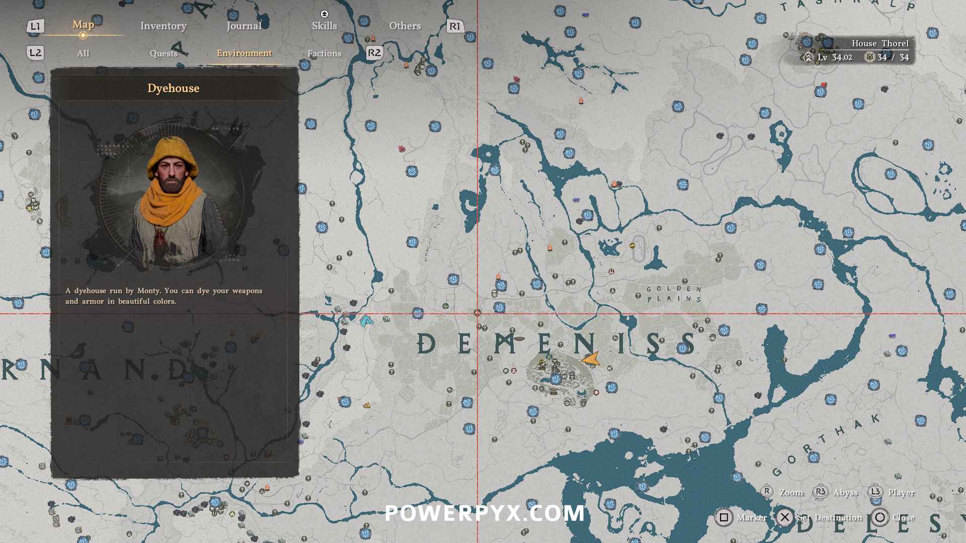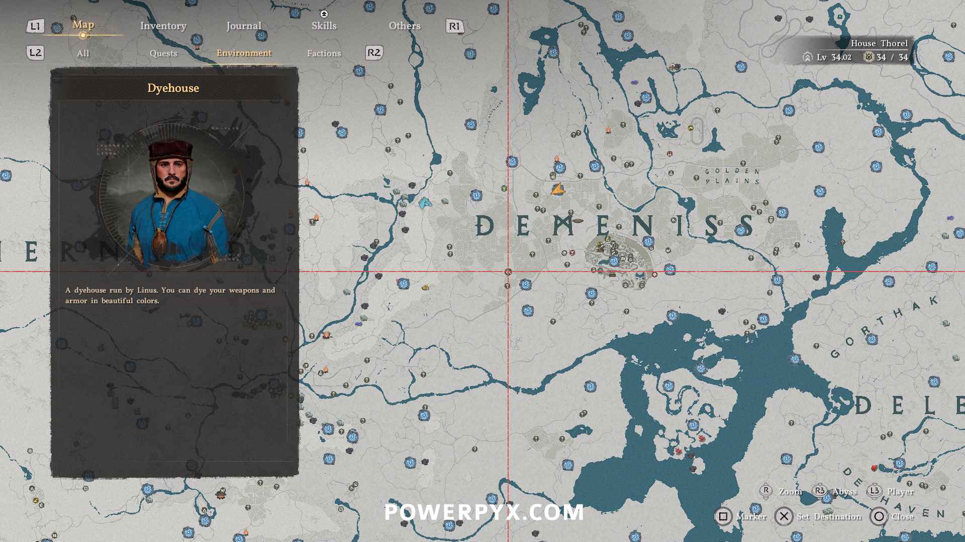 You only need to talk to each shopkeeper at the Dyehouses to satisfy the challenge requirements and it will count retroactively if you find the challenge later. Buying the dyes isn’t necessary, but is of course useful if you want to change the coloring of your armor. The Dyehouses are where you apply different colors to your outfit. After upgrading your Greymane Camp enough, you can also find a Dye NPC at camp that sells all dyes of every Dyehouses you’ve found.