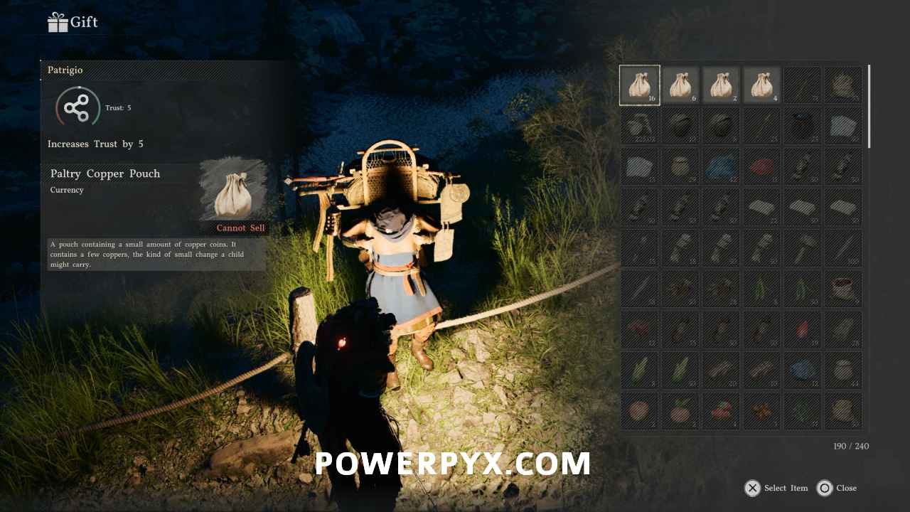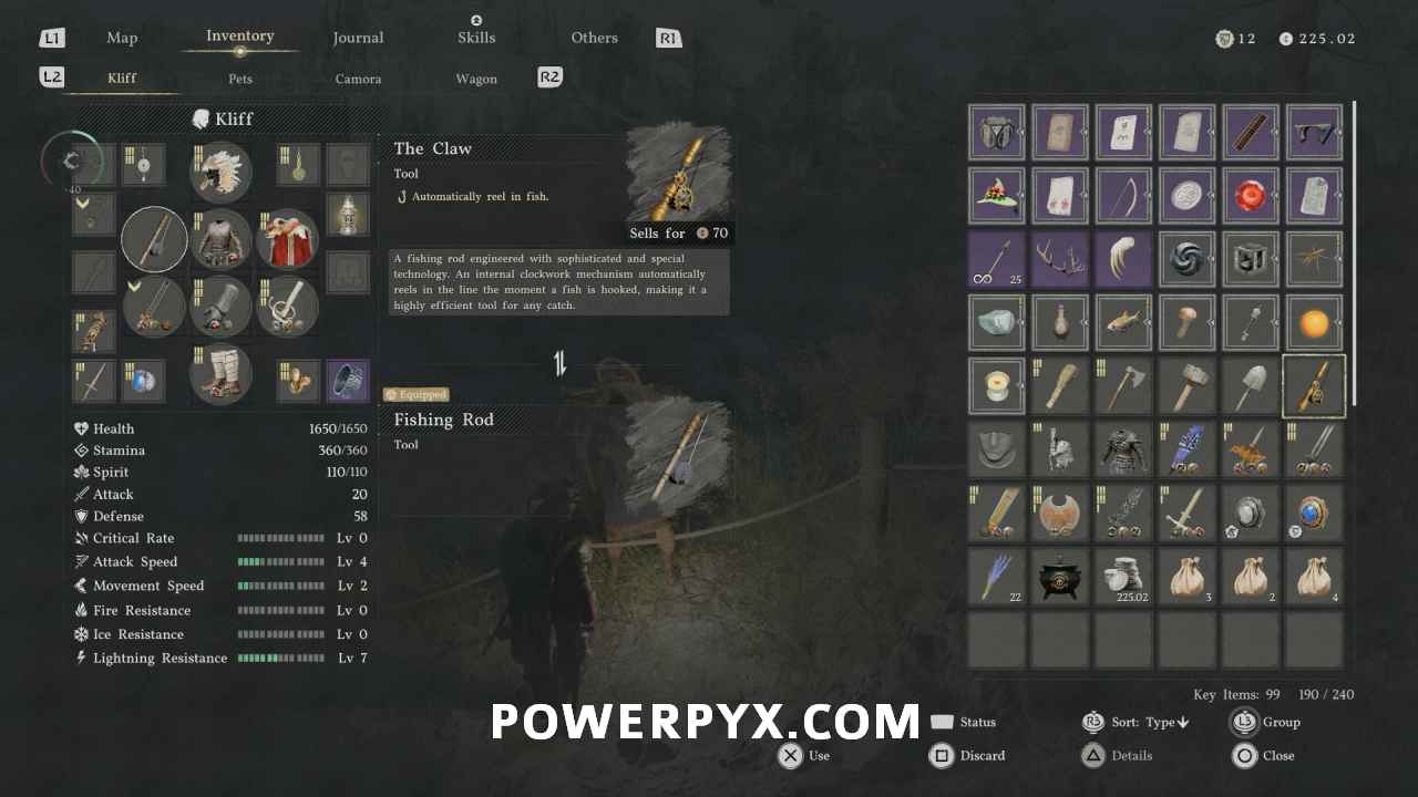 “The Claw” is the best rod it the game and allows you to automatically reel in fish instead of manually spinning to reel. There are two ways you can obtain The Claw: either from the hidden vendor Patrigio, or by stealing it. Patrigio is a secret vendor who only appears along roads between 12AM – 4AM in-game time. One of the easiest spots to find him is along the road leading toward Hernand at Howling Hill, but he seems to be able to appear on most marked roads if you travel on them within the specified in-game times. He sells some harder to get items, but most notably if you reach 100 trust with him he gives you The Claw as a gift.