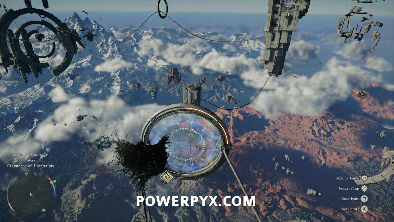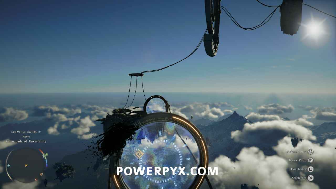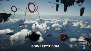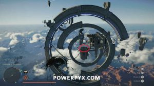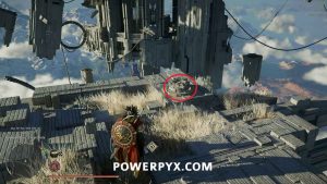 After going through the second ring, you’ll need to glide to the floating platform ahead and land on the small spot near where the light is pointing at another button. Grab it with Axiom Force to activate the next set of fans.