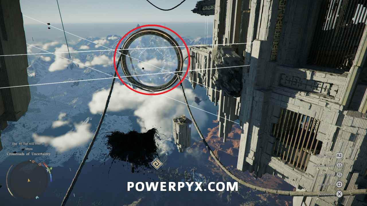 This area is a gliding puzzle, requiring you to progress through the area while gliding through the rings. To start, use Axiom Force to grab the spot on the ground in front of you, then glide toward the first fan after it activates.