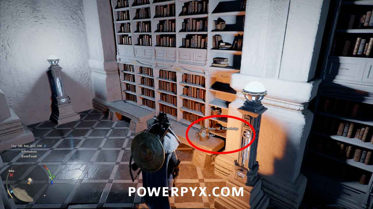 On the top floor, go to the end of the right balcony to find the Helm of Knowledge.
