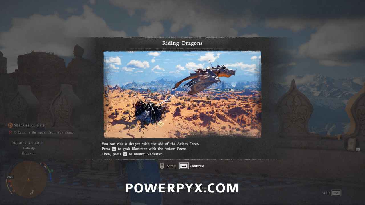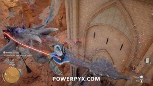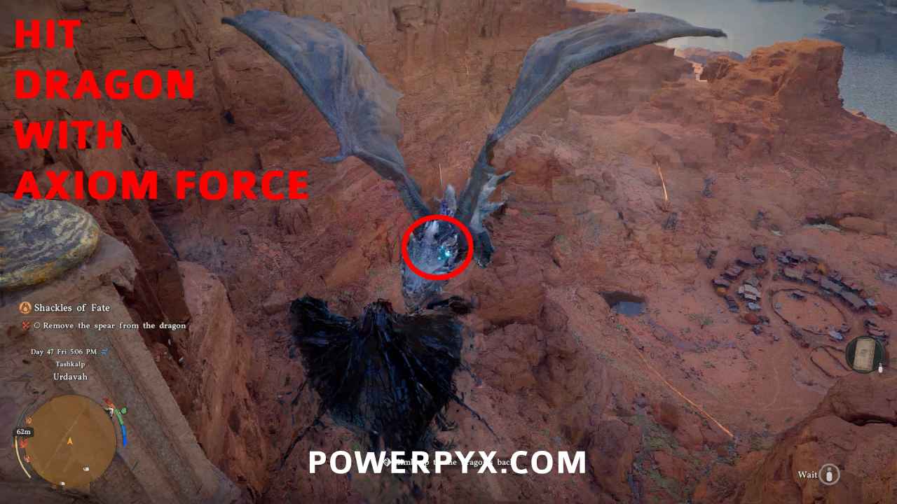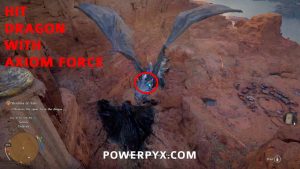 Step 3: Wait on top of the bridge. When the dragon is getting close to the bridge, jump down and glide in the air with your wings (press Square / X / Spacebar). WHILE gliding use Axiom Force to hit the dragon with it (hold L3 / Left Stick / ‘TAB’ key on PC). You should see a blue impact zone where you aim, and you must be close to the dragon because Axiom Force has limited range of a few meters. That’s why you need to fly close to him. As soon as you hit the dragon with Axiom Force (blue glowing line), press Square / X / ‘TAB’ to mount the dragon. The Axiom Force line will briefly glow red if done correctly, and you land on the dragon’s back. The timing is very finicky with this, sometimes the line from Axiom Force will break and you fall down, in which case press the ‘Wait’ button again in midair before you hit the ground. It can take a few tries.