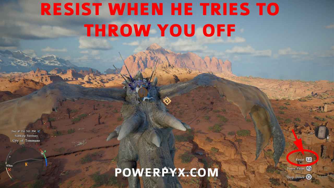 Step 4: If done correctly you will now be mounted on the dragon’s back. You get the subobjective “Hold on atop the trashing dragon’s back” as displayed at the bottom of the screen. Simply stay seated on the dragon and whenever it tries to throw you off (does barrel rolls or flies up/down fast), hold L2/LT/Q to ‘Resist’. You don’t need upgraded stamina for this, if you do it correctly the starting stamina amount is enough to make it. You need to hold on for about 2 minutes until you get a tutorial popup to use Focused Force Palm. The dragon will try to throw you off twice during this. Don’t hold the ‘Resist’ prompt the entire time, as it drains your stamina, only hold it when the dragon tries to throw you off.