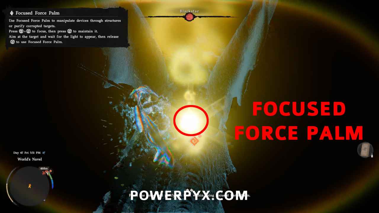 Step 5: Once you get a tutorial popup about Focused Force Palm, use it by holding L3 + R3 > hold R3 / Left Stick + Right Stick > hold Right Stick / Hold ‘X’ key > hold Mousewheel. You must hit the golden glowing dot on the dragon that appears when the screen turns blue from aiming Focused Force Palm at it.