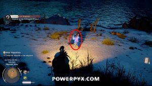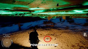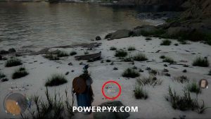 At the beach you will find some enemies and a small orange search area on the minimap. Clear out the enemies first. Then look at the ground in the middle of the search area by holding
