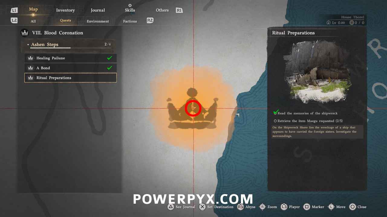 - Quest Description: On the shipwreck shore lies the wreckage of a ship that appears to have carried the foreign sisters. Investigate the surroundings.