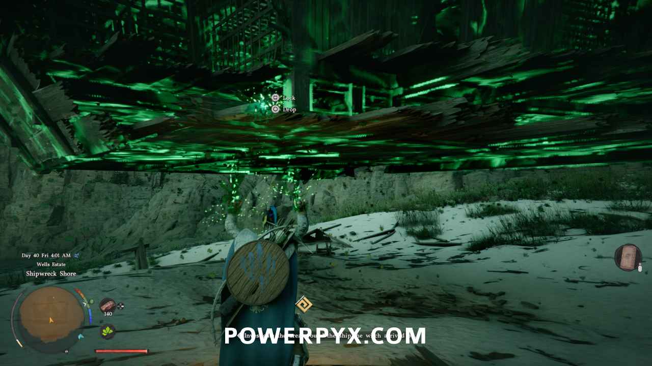 to freeze the shipwreck in the air for a few seconds. Quickly grab the Censer from under the shipwreck, in the center. There’s also a hole under the shipwreck, if you let the wreck fall while you stand under the hole you can get into the ship to find some loot and open the locked door.