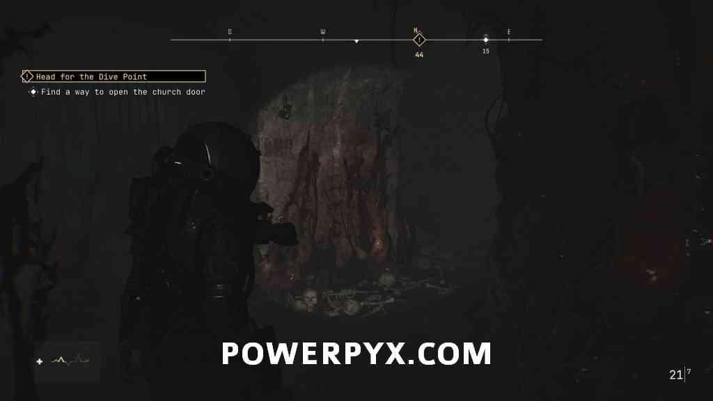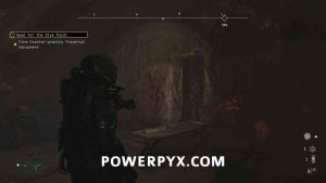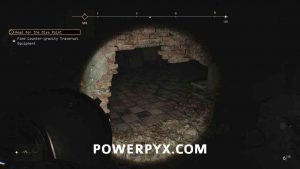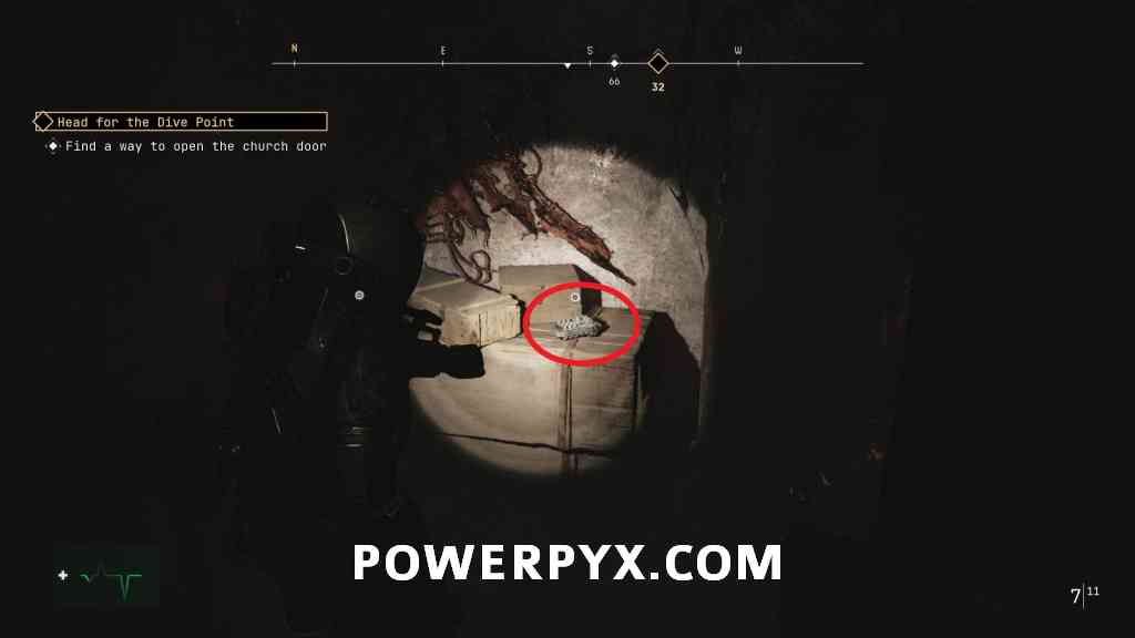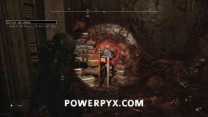 Once you enter the catacombs, you will move a metal object to further access the tunnels. Immediately past it, look left to spot a boarded-up door. Shoot the boards, then continue around the corner to find a door covered in biomass. Burn the biomass with a Torch or Pyre, then enter the two doors to find this on a crate in the corner.