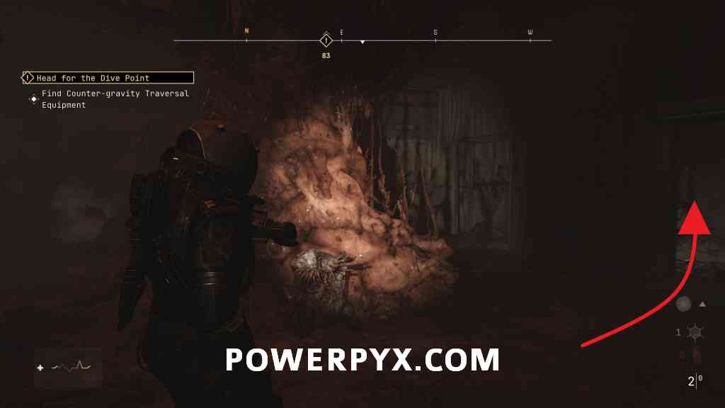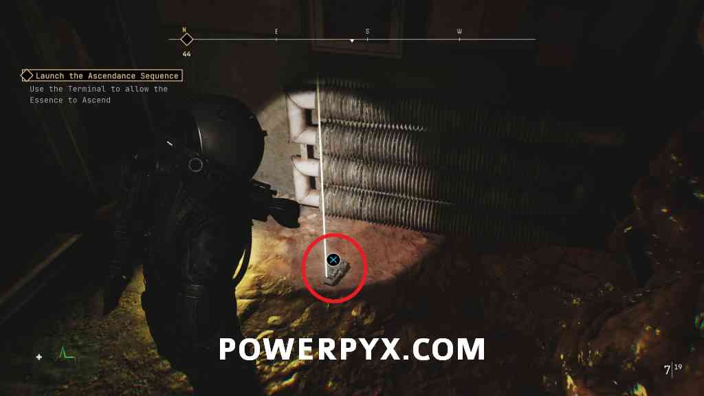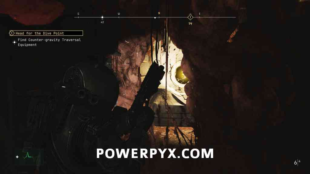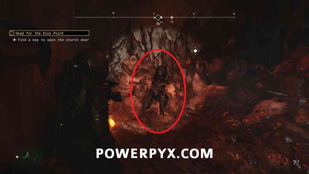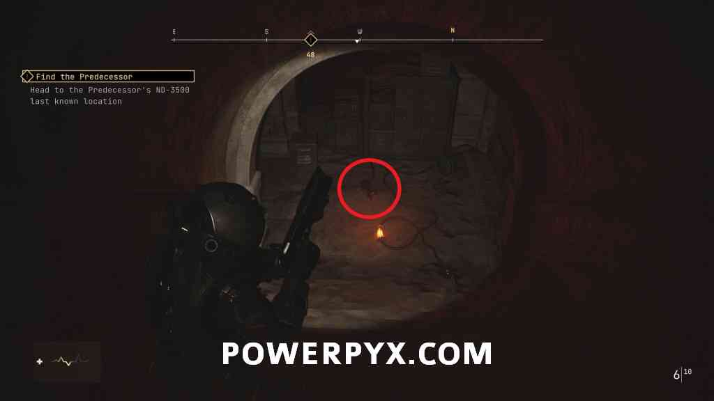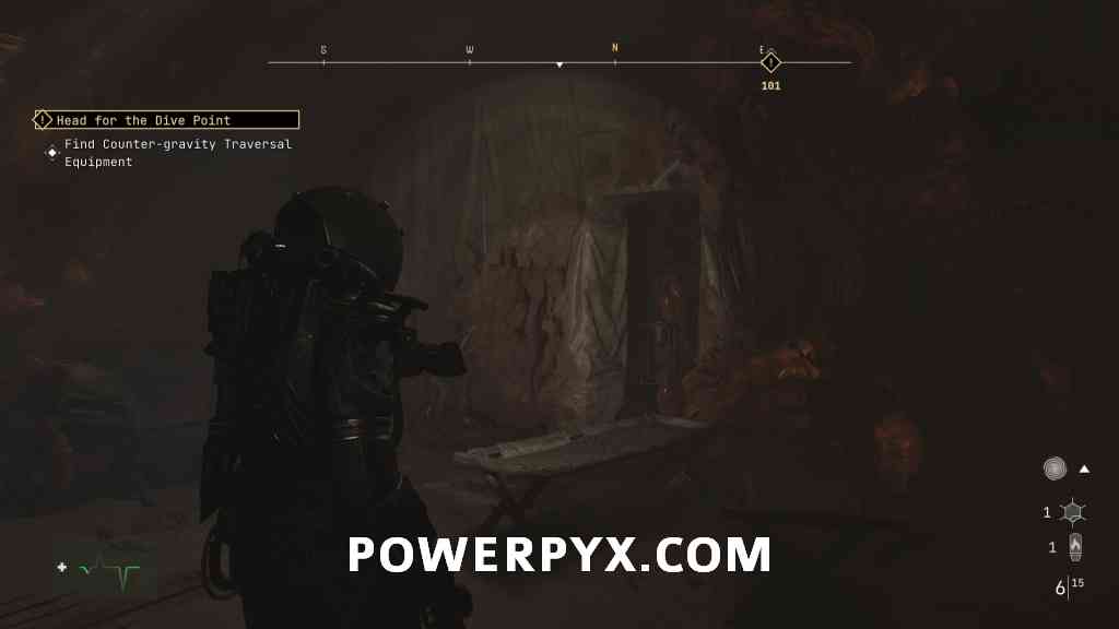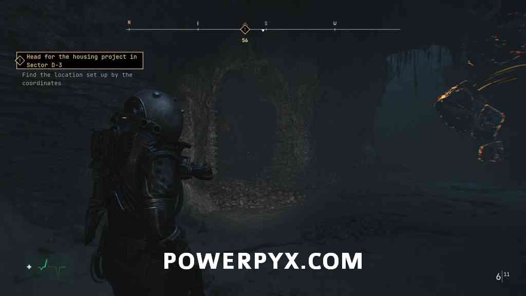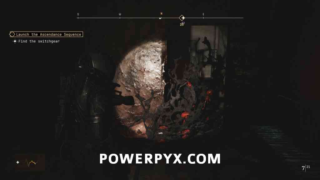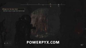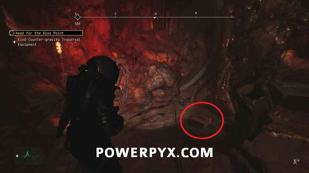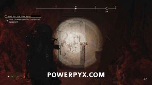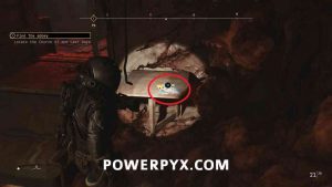 Once you are outside, progress until you drop down into a cave-like area. You will get a tutorial for burning Orphans in a room with a Torch Fuel dispenser. Instead of going left here, turn right and there’ll be a hole you can crawl through. There will be a core in a dispenser in this area.