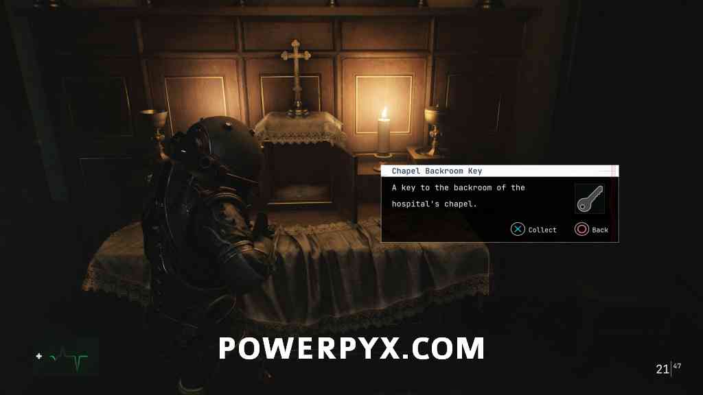 Inside the Chapel back room. In order to get inside, you will need to find the Chalice in the Director’s Office (code to the door is 9509) in Administration, as well as the Vasculum in the Operation Block next to Cat #7. Place both of them on the altar to receive the back room key.