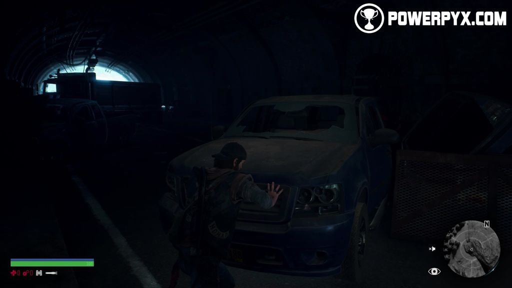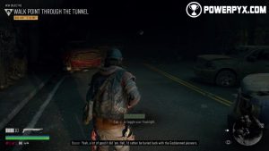 On your way to Crazy Willie’s you’ll encounter tunnel. Boozer stops his bike and Deacon reconnoitres. Follow the on-screen prompts to turn your flashlight on and continue on.