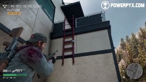 To bring down the ladder, shoot the lock. Climb it and have Sarah use her ID credentials to unlock the emergency exit. Mission complete.