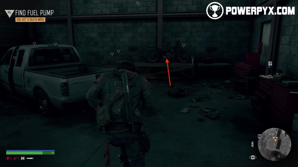 Once inside, you can find the fuel pump in the actual garage. You can remove it from the motorbike standing on the counter.
