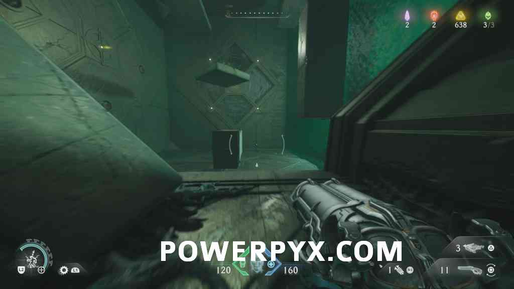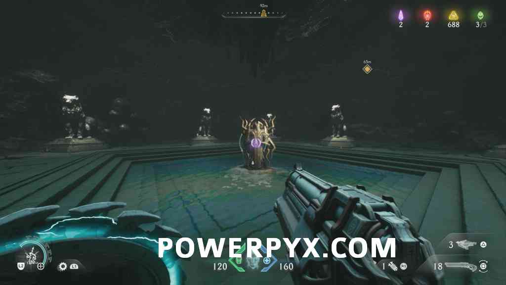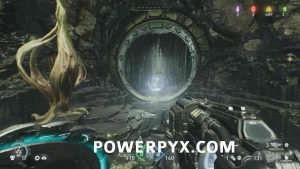 Inside, you will be teleported to a room with a closed gate on the other side and a pool in the middle, jump into it, and dive to the bottom, and you will fall onto a platform. From here, throw your shield behind the closed gate.