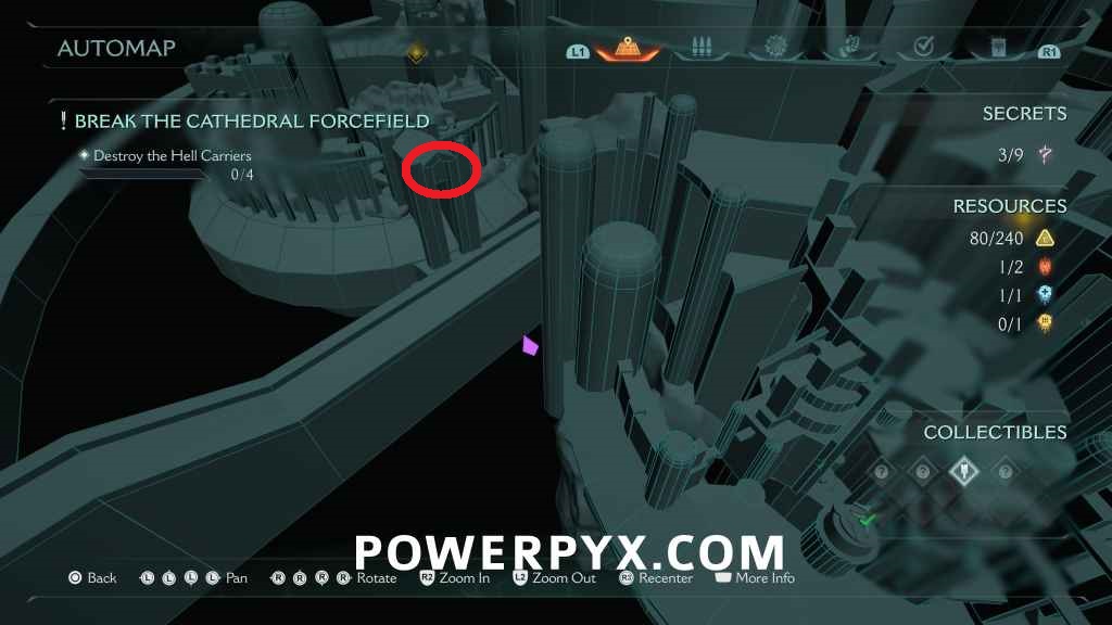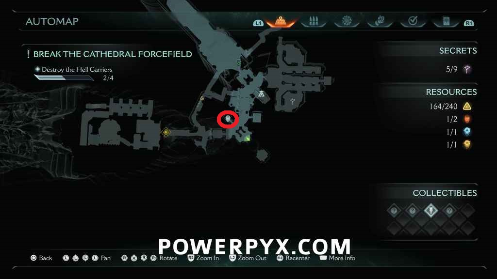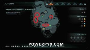 The first secret landing zone is to the left of the big open area where you are instructed to destroy 4 Hell Carriers (spaceships). Look to the left to see a Titan demon on top of a tower close by, kill it and then land. Destroy the tree and kill all demons here to spawn the leader, kill it for the demonic essence. After this you can drop down and go beneath the area to find the secret, 5 gold and a chest containing 50 gold.