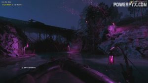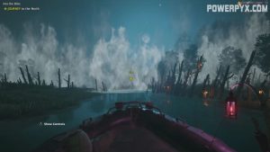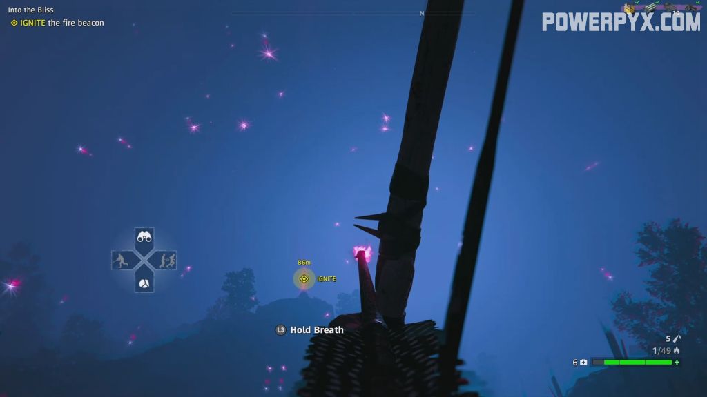 A second objective is added as soon as you cross the wall of fog, and a subtle reminder that “Fire protects you from Bliss” flashes on the screen. Head to the new waypoint until the “Journey to the North” objective completes, and in the distance you will see the waypoint has moved to a beacon that you have to light with fire arrows. Once the flames catch and the Bliss is pushed back, a new objective will activate and you can proceed.