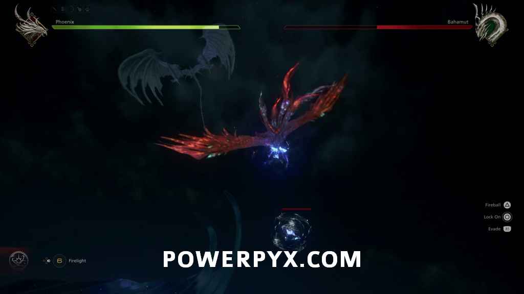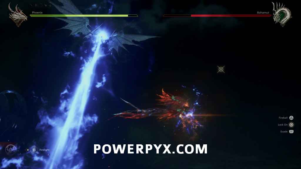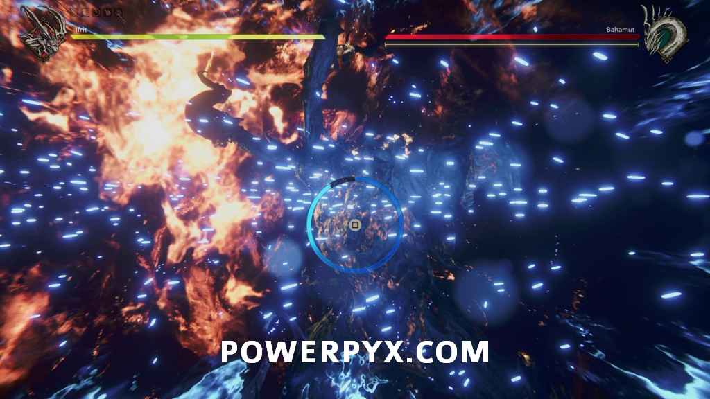 After the first stagger phase there will be a scene, then you will be playing as Phoenix like you did earlier in the game. This section is a shooter again, where you need to attack Bahamut by aiming at him and shooting with :tr: . Where you are aiming is also where Phoenix will fly, and you need to keep this in mind to avoid attacks, though you can also evade with :r1: . You should generally always hold :tr: to charge up your attack before releasing, as this shoots a more damaging beam that last a few seconds.