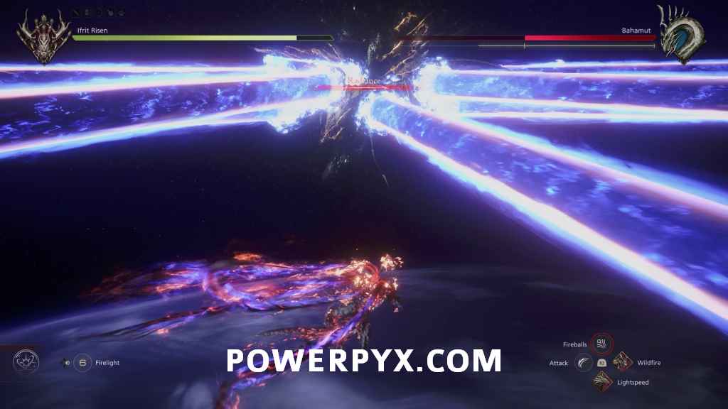 This will happen a few times, then there will be a scene and you will learn Spitflare, which is a ranged ability performed by pressing :r1: + :tr: . As the game prompts you, you should do this when Bahamut performs Quintessence, where he summons a long line of orbs in front of you. Direct the beam to destroy all the orbs, then return to attacking Bahamut.