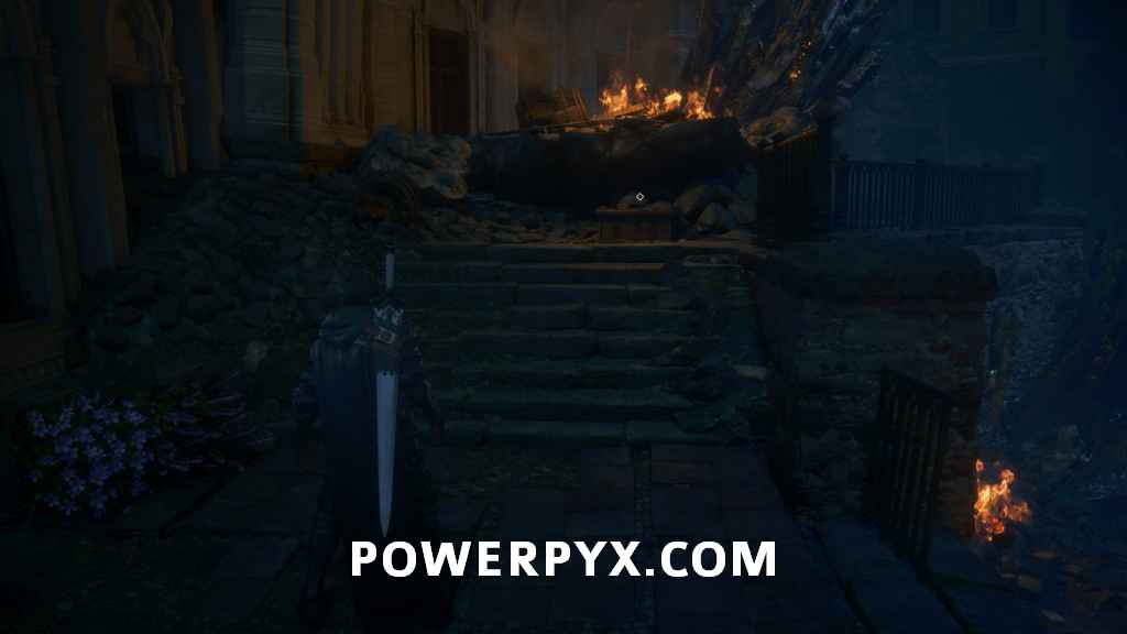 Continue along the castle battlements until you reach a larger area where you’ll fight a second Dragoon Lancer. Deal with them and continue into the next room. Go down the stairs where the enemies were and at the bottom on the left you can open a chest containing the accessory The Favor of Earth (Raging Fists) before going through the doors into the next area.