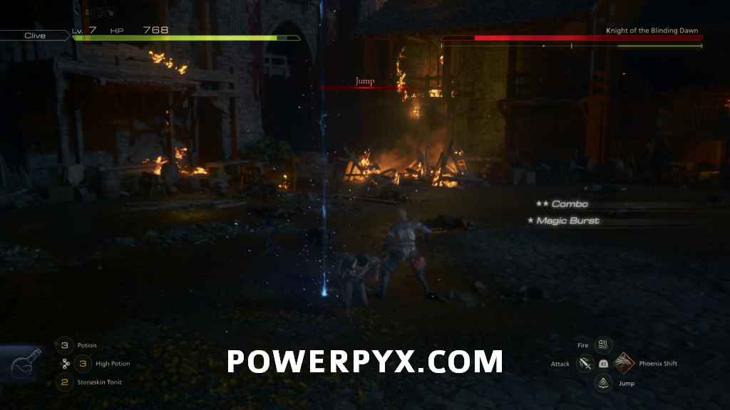 After a while, the Knight will start doing the main named attack they utilize, called Jump. The Knight will jump into the air, then slam down into a specific spot represented by a vertical beam of light. As long as you take note of when the Jump command appears at the top of the screen you can avoid both this and the later variant Double Jump by just running in a direction, as the Jump won’t occur faster than Clive’s base movement.