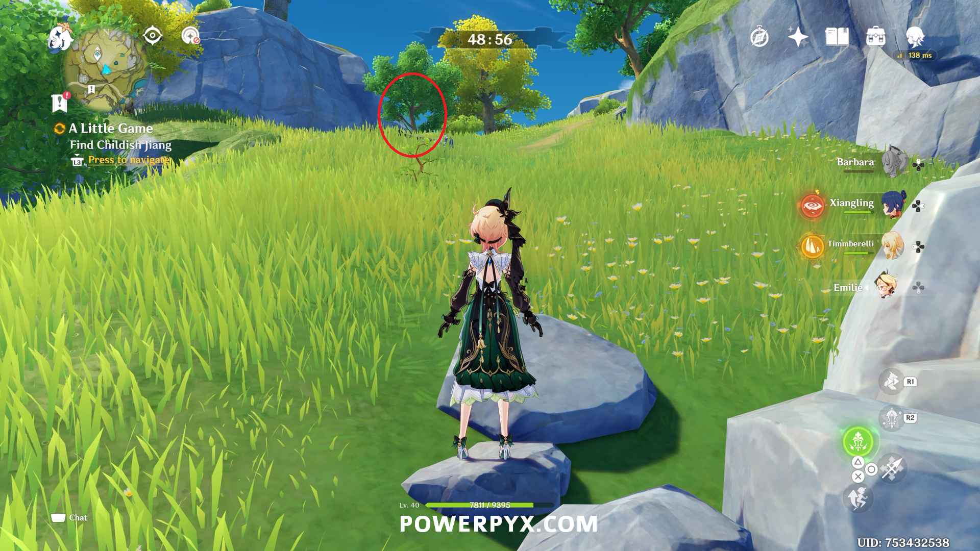 Hide-and-Seek Location #2: This time around, Childish Jiang only gives you 50 seconds to find him. When you gain control, run straight ahead to the tree circled below.