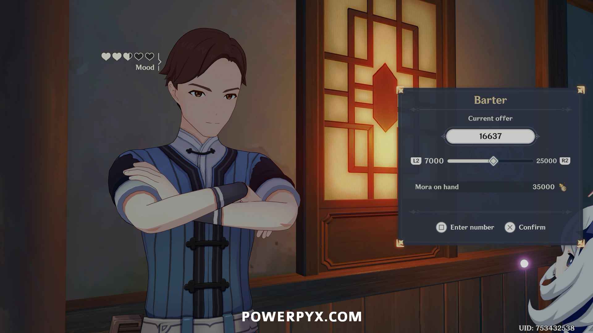 With each of the three workers, you can choose to barter with them on price. Move the slider to adjust the price and then hold the confirm button to submit the offer. This matters because you get to keep the leftover Mora after buying from the three workers.