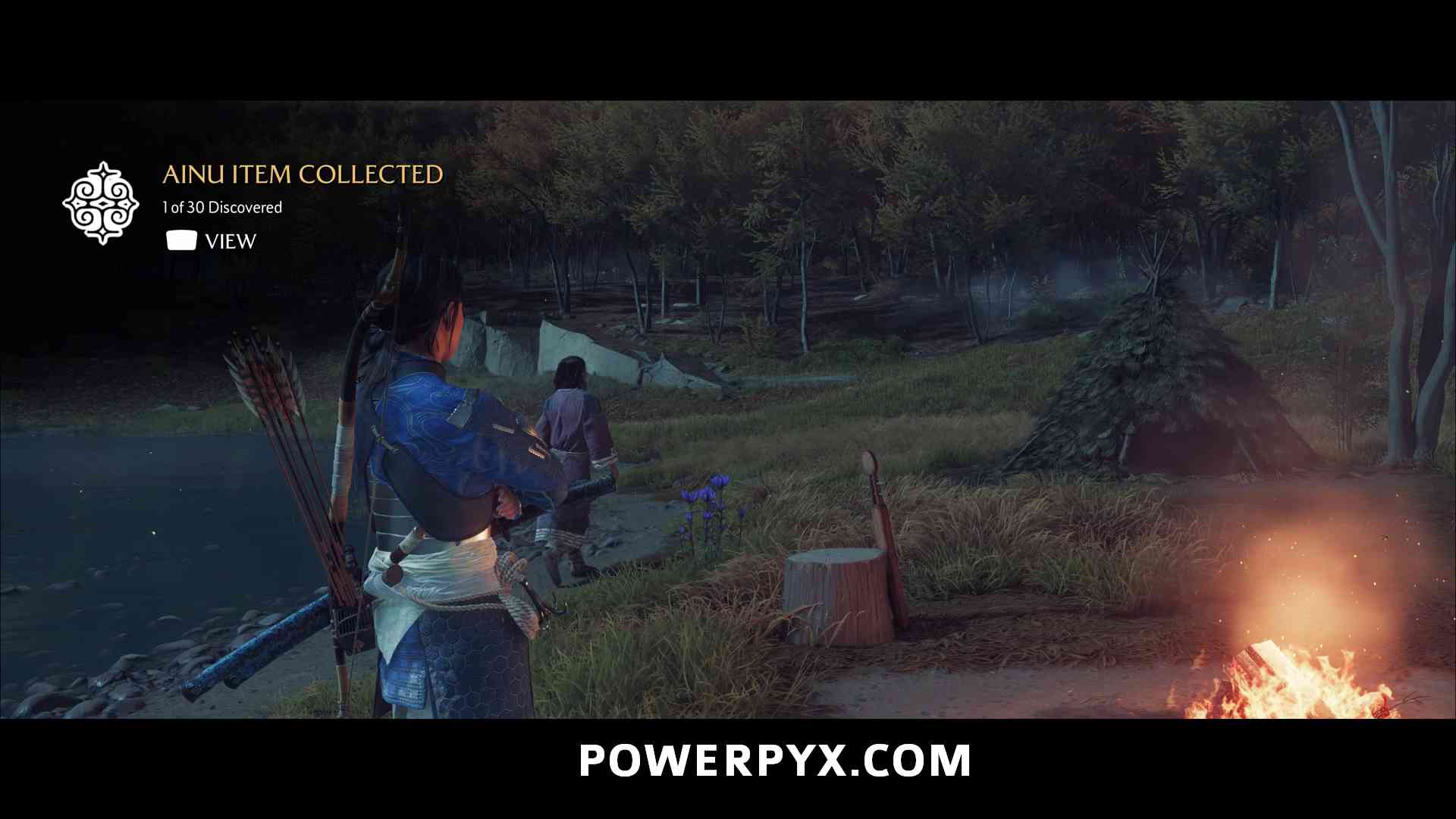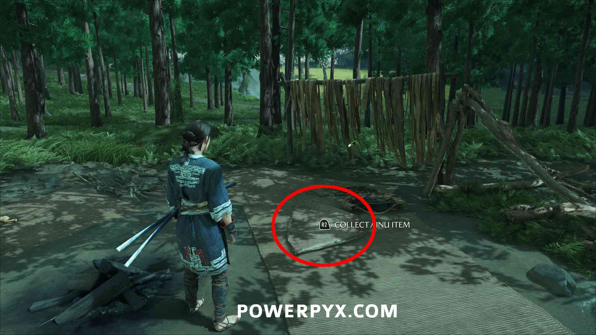 Ainu Item #6 – In an area with trees around it near the river. Must cut through the bamboo to enter the area with the trees, then find the Ainu Item in a little camp.