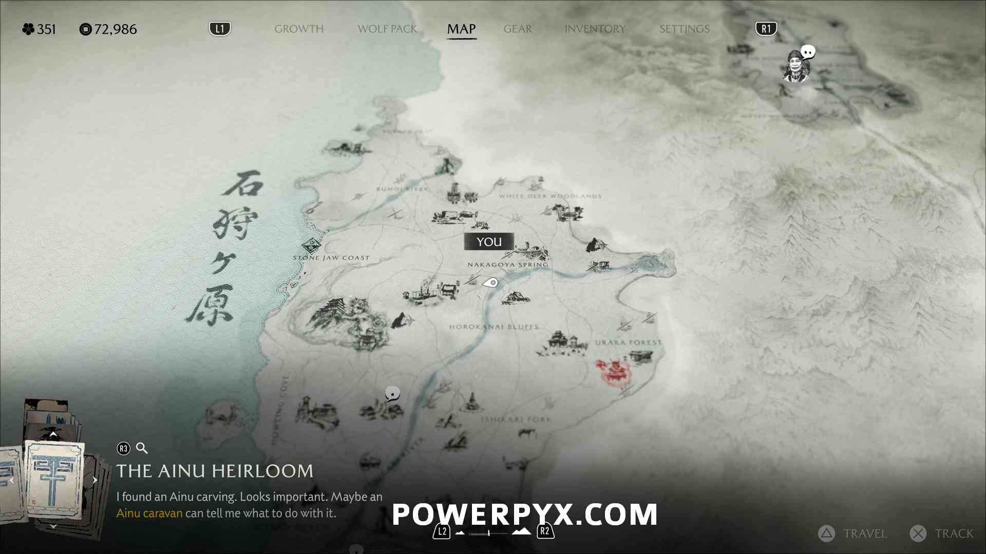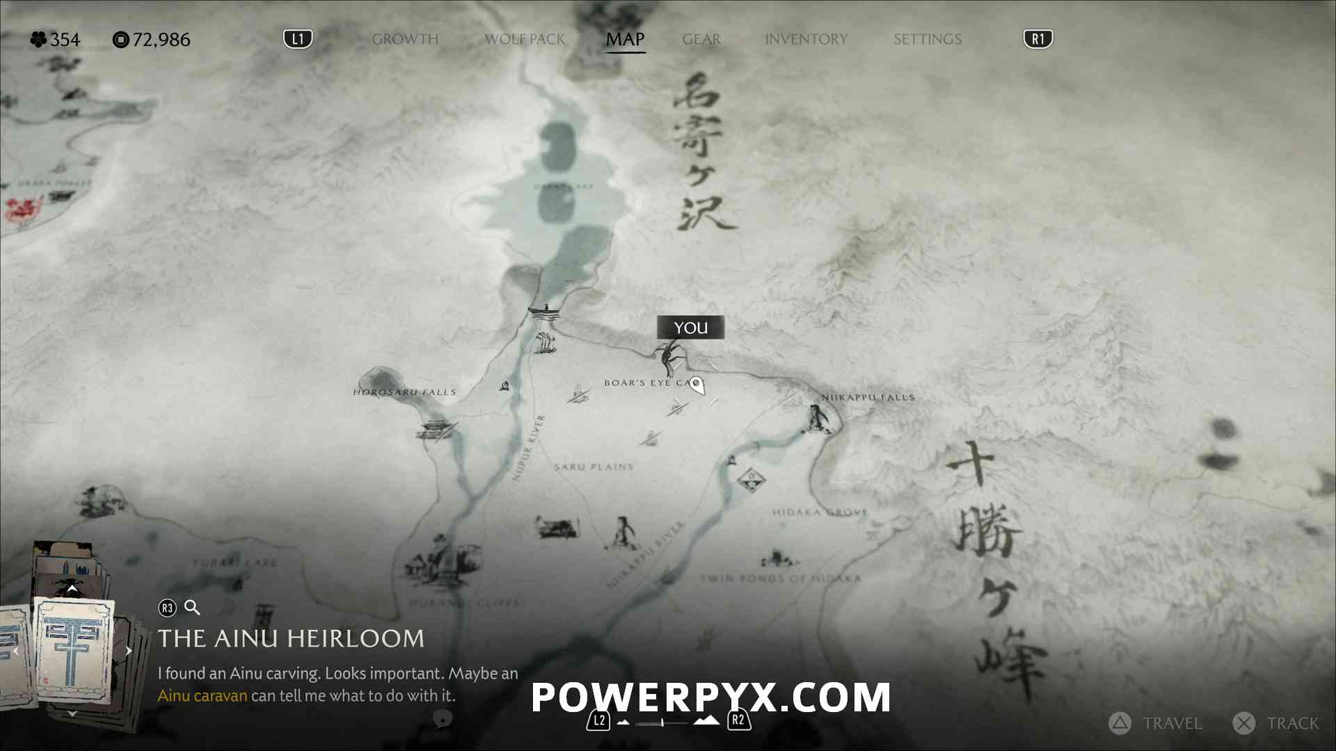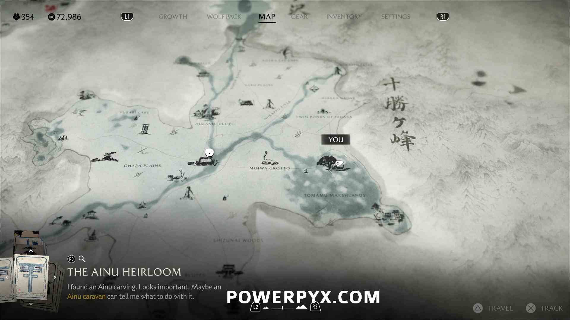 Ainu Item #22 – On the cliff on top of a mountain, where the “ru” of “Sakuru Woods” is on the map.
