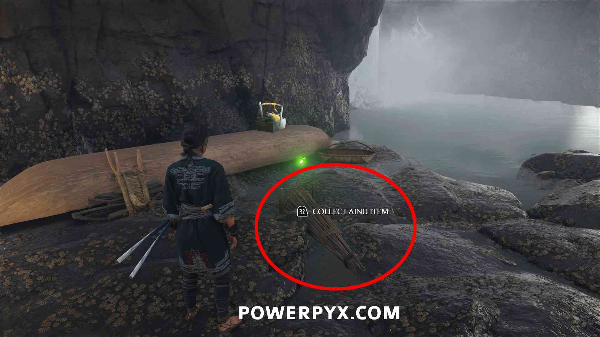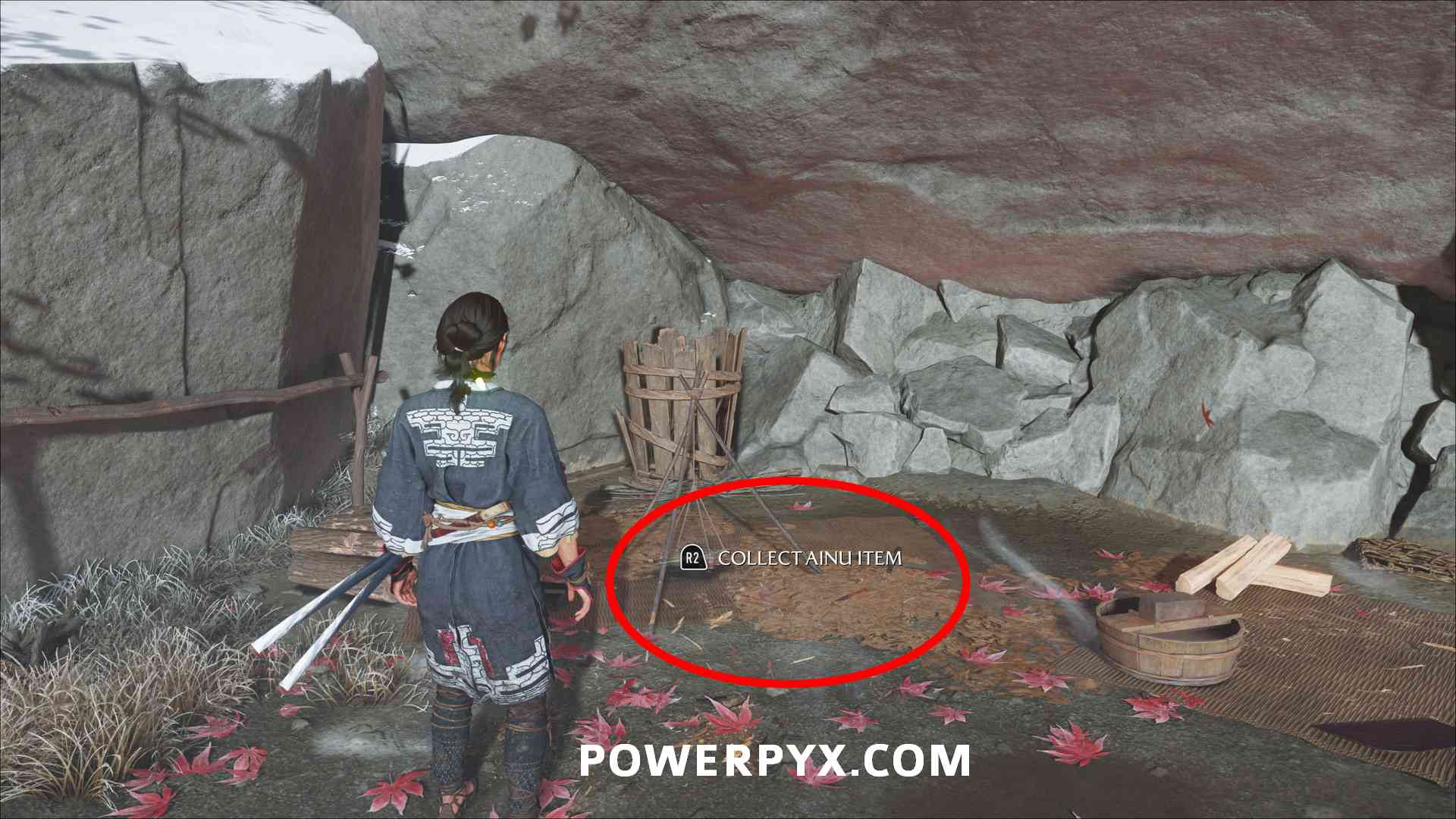Ainu Item #26 – Inside Cape Inari Hideout, in the building in the back. You enter this camp through Cape Inari Shrine. Must squeeze through a gap to the right of a locked door to enter a cave where you pick up a torch, then light the lantern in that cave and light a second lantern through a gap further left. Then continue to light lanterns with a torch and climb up to the camp.