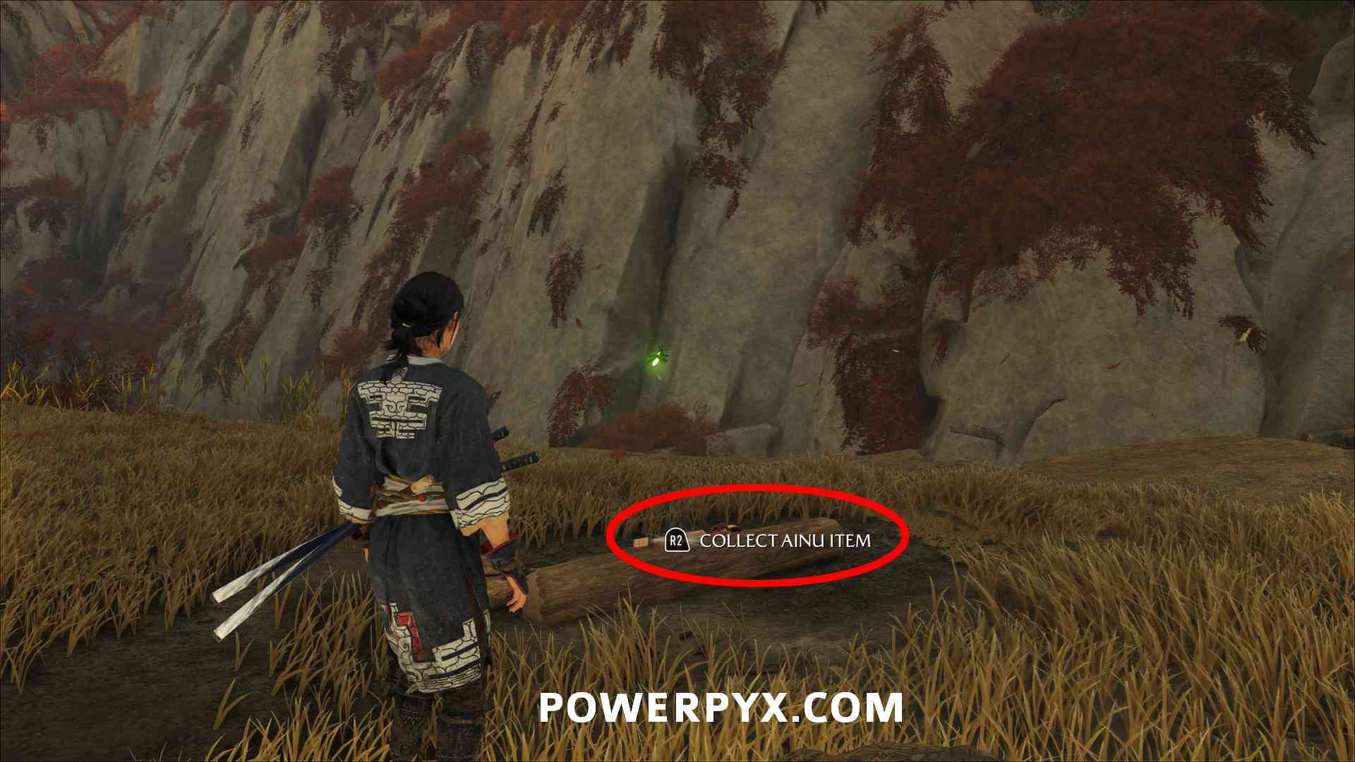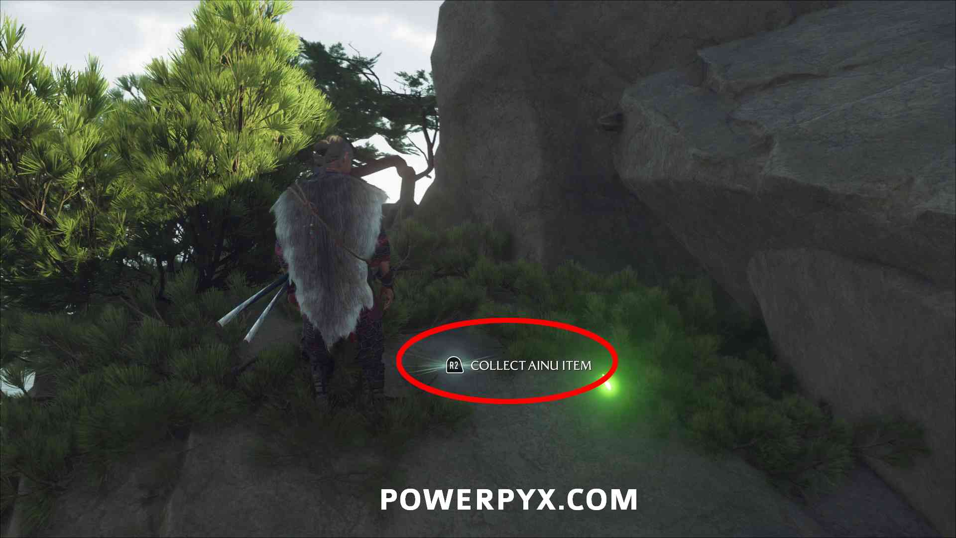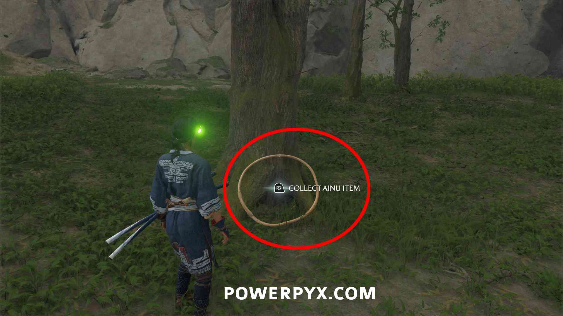 Ainu Item #20 – Requires Mythic Tale: The Legend of Opusnupuri. During this tale you pull down the destructible wall on the mountain in the south of Nayoro Wilds. Then you can enter the area behind the destructible wall. Jump over the first ledge and then use the grappling hook to pull yourself up a tree stump. After this check the alcove on the left for the Ainu Item.