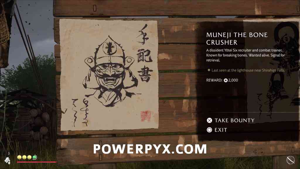 Muneji the Bone Crusher Starting Location: Yotei Grasslands > Bounty Board at Old Inn / Yotei Shadow Inn