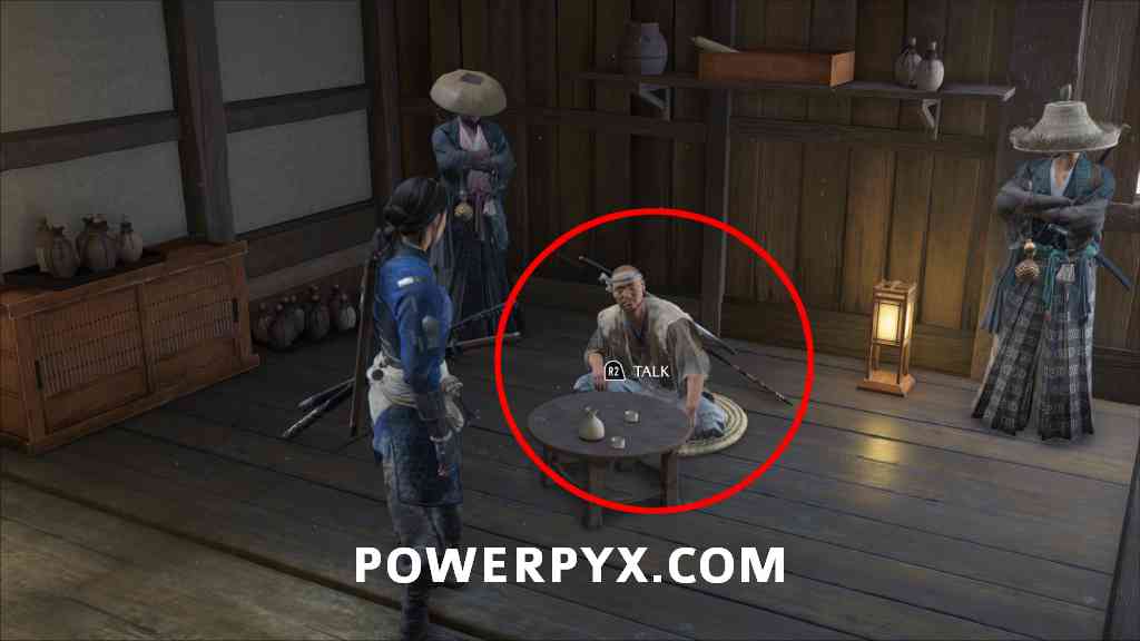 Talk to him, he will challenge you to a minigame of Zeni Hajiki. You must agree to play him and bet 1000 coins. However, he is cheating and gave you a weighted coin that causes your coin flicks to not go in a straight line, so you will almost certainly lose the match. After losing, try to leave the building and a settler will talk to you at the exit. Follow him outside, he reveals that Inagawa is cheating you with weighted coins. Afterward, climb up the roof of the sake house and through the open window on the front to enter the attic. Here you must interact with the coin pouch at the end of the attic to switch out the coins. Now challenge Inagawa to another match and bet 1000 coins again. This time your flicks will go in a straight line and you should win easily. After you win, he comes with you willingly, but his men ambush you outside. Now you fight Inagawa and can kill him for the bounty.