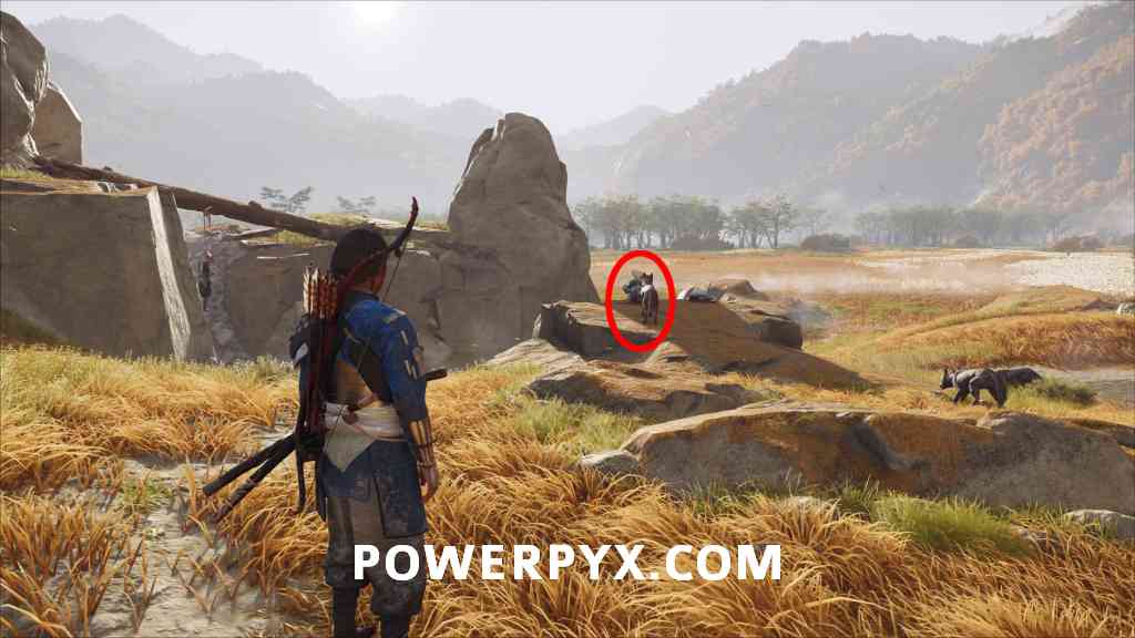 Now go to Moiwa Grotto slightly east of Huranui’s Rest Inn, where the side tale took place. In front of the grotto, defeat the dogs and talk to the wounded ronin sitting on the rocks. He tells you Chuta is in the woods with yellow trees north of Niikappu River.