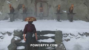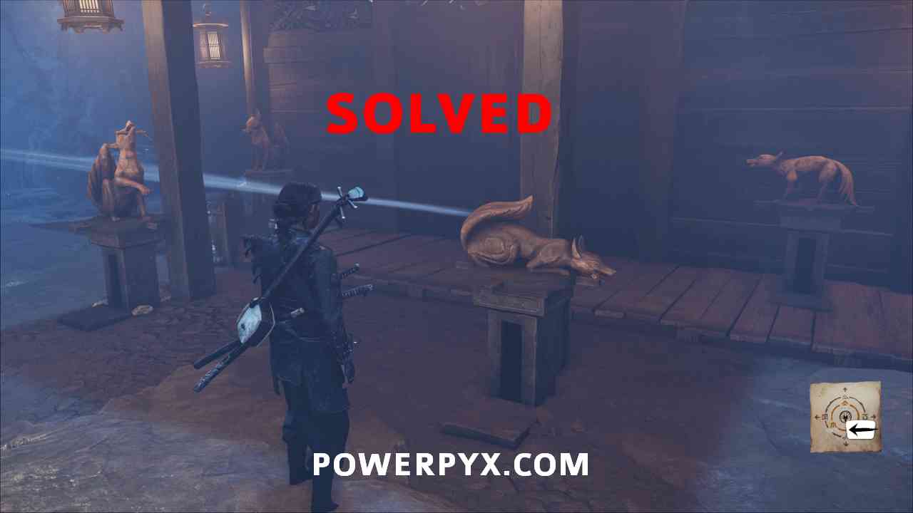 Grab the two statues in this area and mount them onto the empty spaces. You must place them so the foxes are facing towards the gate (not away from the gate). Meaning, the fox that faces right goes on the left pedestal, and the one that faces left goes on the right pedestal.