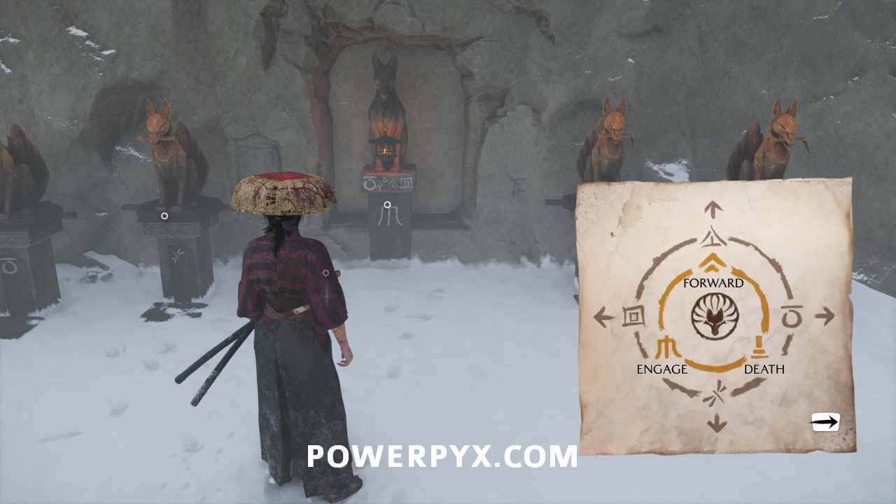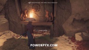 On the east side of the camp is an altar with five different fox statues. Each one has a symbol. You need to turn the outside four statues to match the direction the symbol indicates.