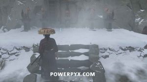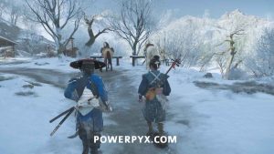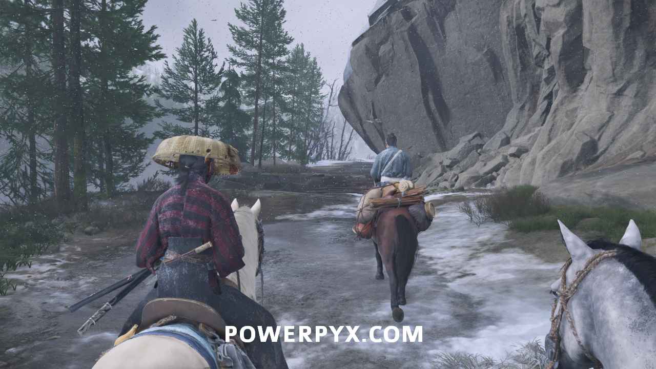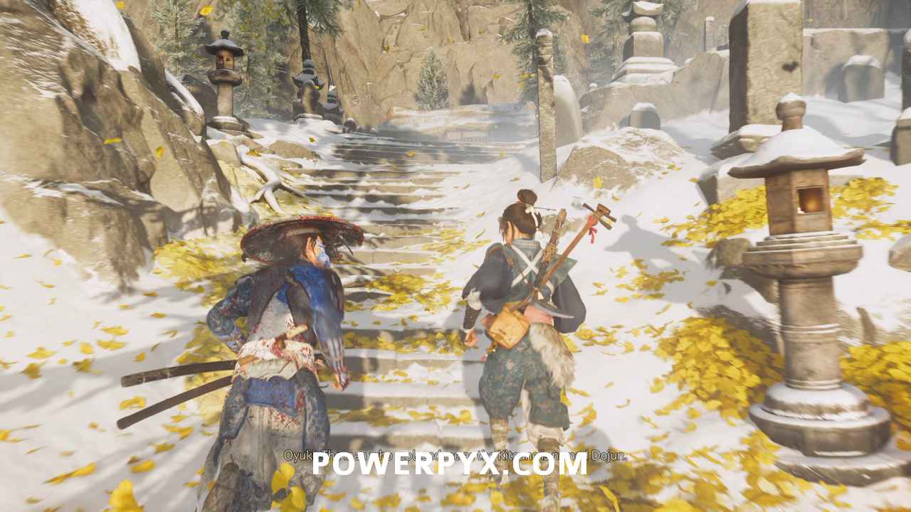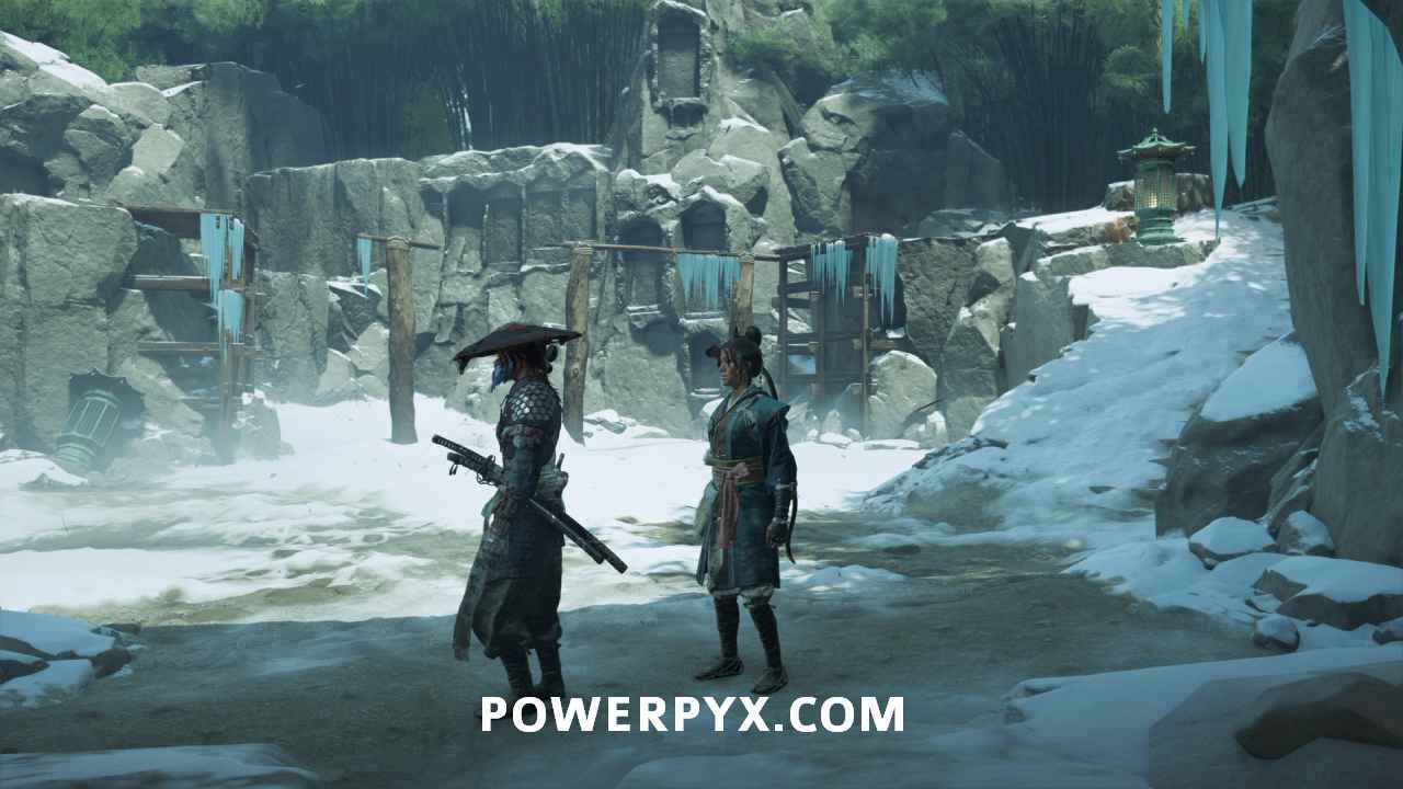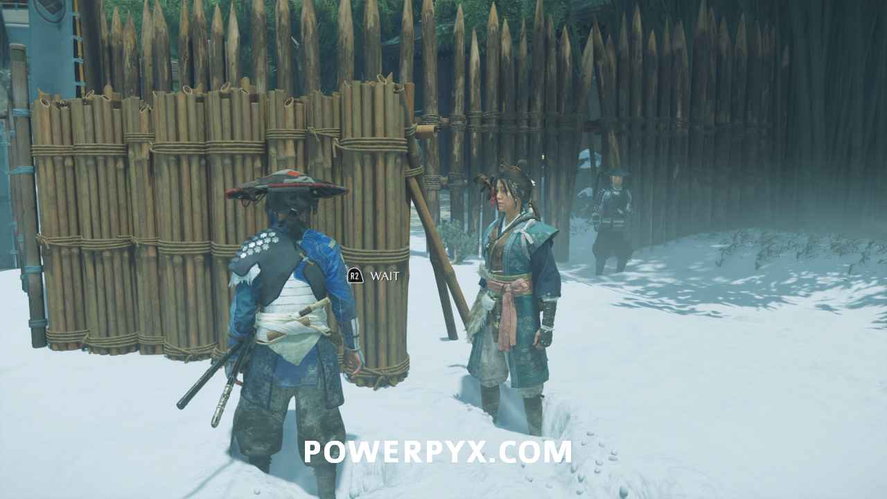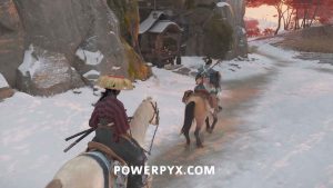 Head outside with Oyuki and get on your horse. Then continue down the road with her. Choose whichever dialogue option you like when the choices appear. Eventually, she leads you to a frozen waterfall.